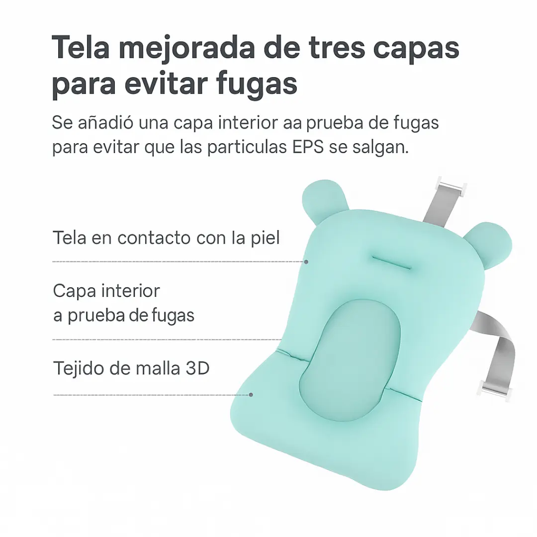 Fabricado con algodón de lycra premium y malla 3D transpirable, relleno de partículas EPS ultralivianas que garantizan flotabilidad y suavidad. Su diseño anatómico se adapta perfectamente al cuerpo del bebé, cuidando su columna y manteniendo su cabecita siempre fuera del agua.